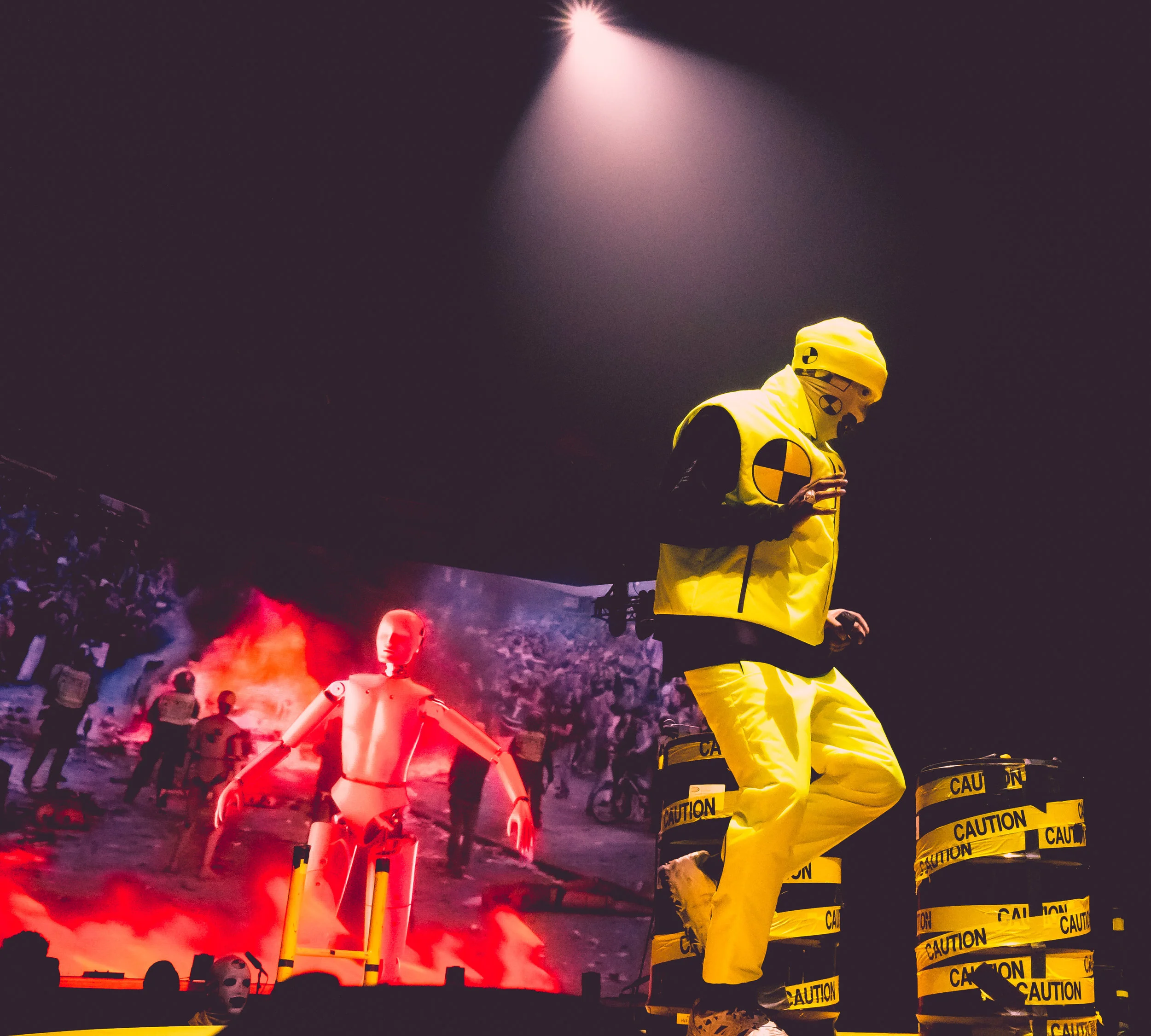 By naming his latest album Testing, A$AP Rocky signaled that he was taking fans on a detour from his previous three records. The sonic and visual experimentation present in Testing’s translated to the stage production for his tour. The loud contrast of black and yellow from caution tape served as inspiration from the stage design, which was splashed on the main stage, to A$AP Rocky’s clothing choices, decked out in a crash test dummy mask and donning a Prada vest with a massive crash test logo. Two hypemen entered the venue with signs that demanded concertgoers be ready to mosh. A$AP Rocky opened his set with “A$AP Forever,” playing out like a victory lap that reflected on his career and his impact on hip-hop culture thus far. The second song of the set, “Yamborghini High,” paid respects to the founder of the A$AP Mob, A$AP Yams, and carried over the intense momentum present from the very start of the show.
