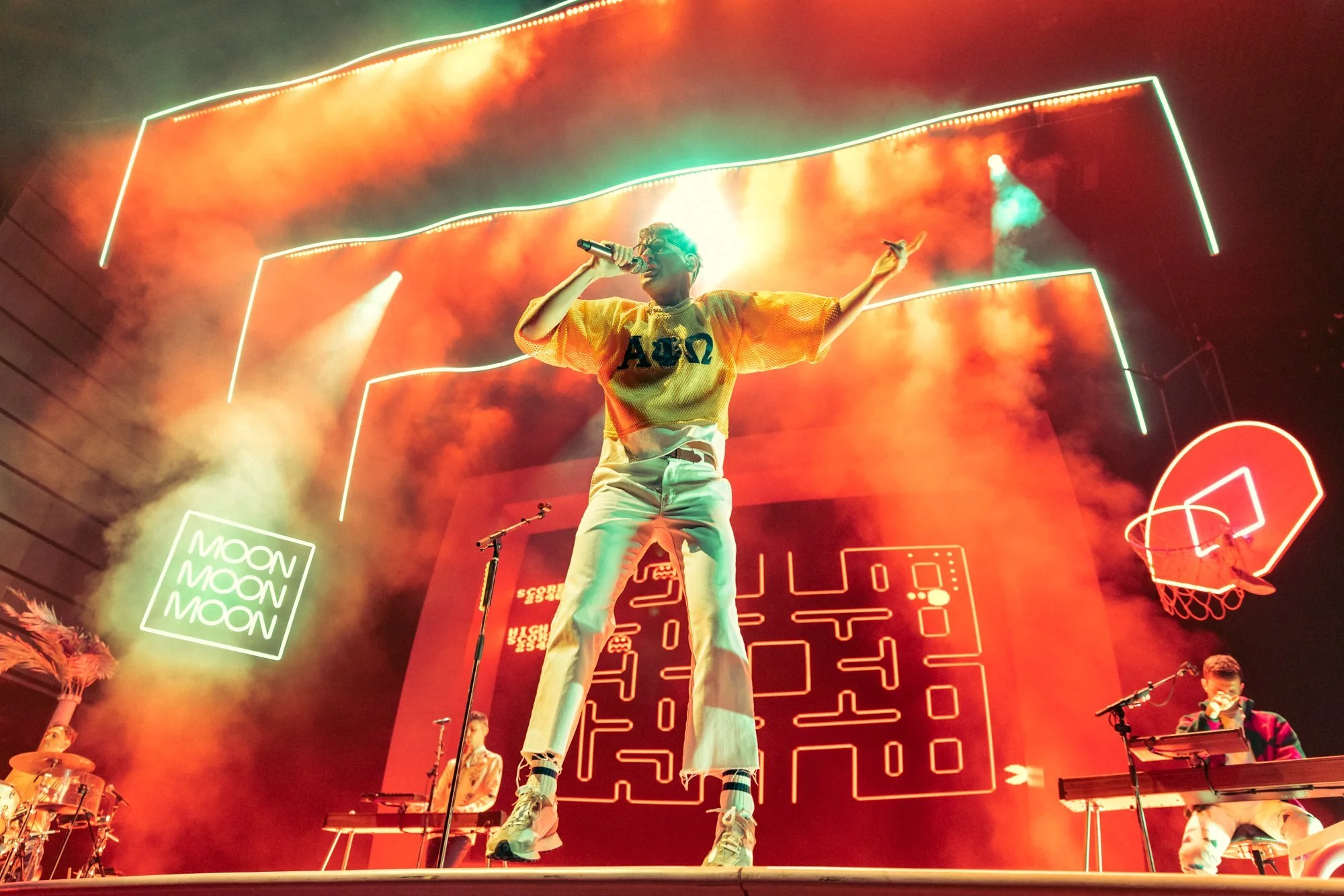 The stage was set up like a swimming pool, equipped with a diving board and ladder. A giant retro computer screen played vaporwave graphics in the background. The band took the stage and eased into their set with the delicate title track from their latest album before diving into the more upbeat “Life Itself.” The 16 song setlist featured songs across all three of their albums with highlights including Dave Bayley performing most of “Tangerine” while bouncing on top of the diving board and a version of “Black Mambo” mashed up with “Hot sugar.” They finished the night with “Pork Soda” before returning to the stage for an encore of their 2 smash hits “Tokyo Drifting,” and “Heat Waves.”