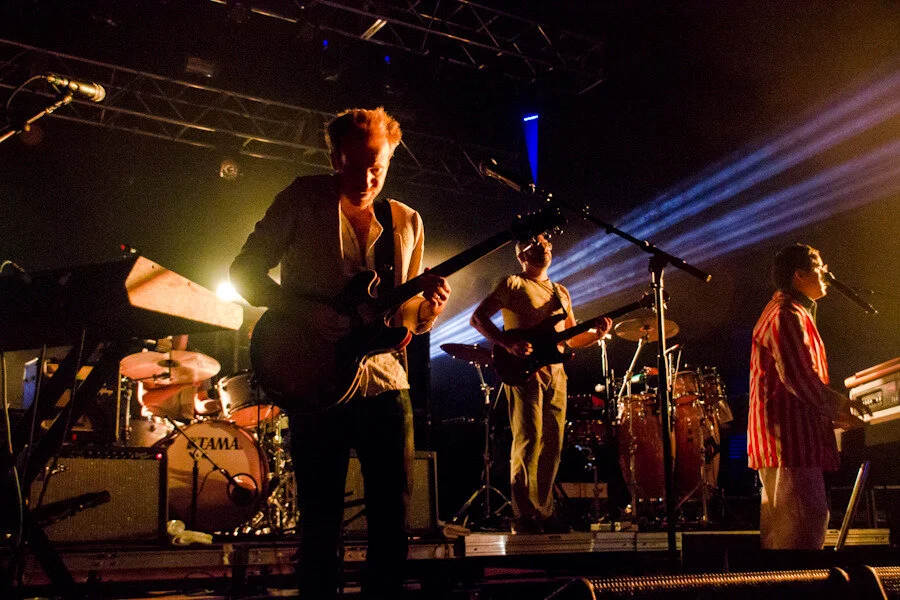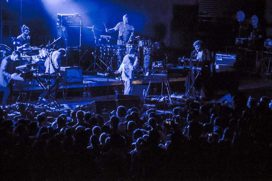 Hot Chip tweaking ALL of the knobs @ Merriweather PostReal-time tweaking of the digital things brings us, at long last and rather late in the night, to the headliners, Hot Chip, who are as skilled and hands-on a live electro-pop band as one might find. To recreate their artful tunes in concert, it took seven guys, savvily switching up, often mid-song, across bass, guitar, percussions, mics and so many keyboards. They matter-of-factly whip out four-part vocal harmonies while playing and manipulating an array of analog synths, stringed instruments, and acoustic beats from dual drum kits, steels, tambourines, and who knows what else. It’s quite hard to keep up, frankly, as at this point in their career, these guys are total pros, having perfected both the nerdy art of computer music along with their telltale tender songwriting touch. That the thoroughly desensitized crowd was still feeling it, on their feet and dancing as soft-voiced Kip-Dynamite-esque frontman Alexis Taylor and his bookish British brethren belted out some of the best of their five-album library, is a testament to Hot Chip’s chops. They played gems and live favorites from each album, including several from their latest In Our Heads – complete with a surprising and perfectly executed blend of “Ready for the Floor” and Fleetwood Mac’s “Everywhere.” Unfortunately, their set was cut short without even an opportunity for an encore or proper goodbye.