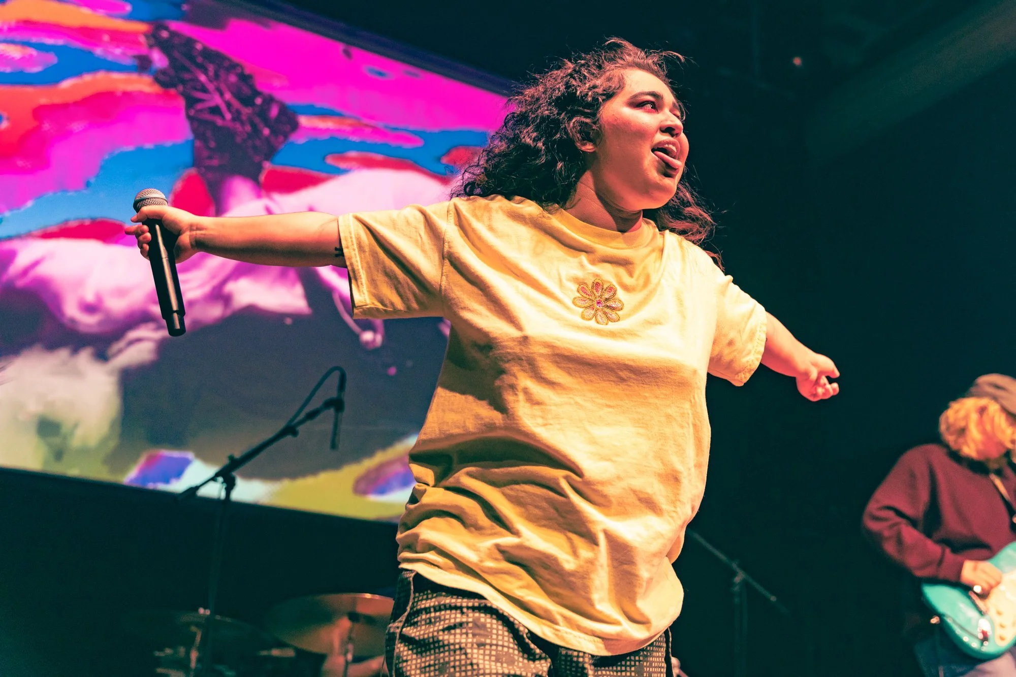 On a stage set up like a trippy kindergarten classroom (featuring a furry painted couch with plants and psychedelic carpet) scenes from her vibrant music videos flashed across a screen as she started out the show with her explosive album opener, “Liquor Store.” The crowd was sprinkled with cow printed bucket hats and they screamed along to every word.