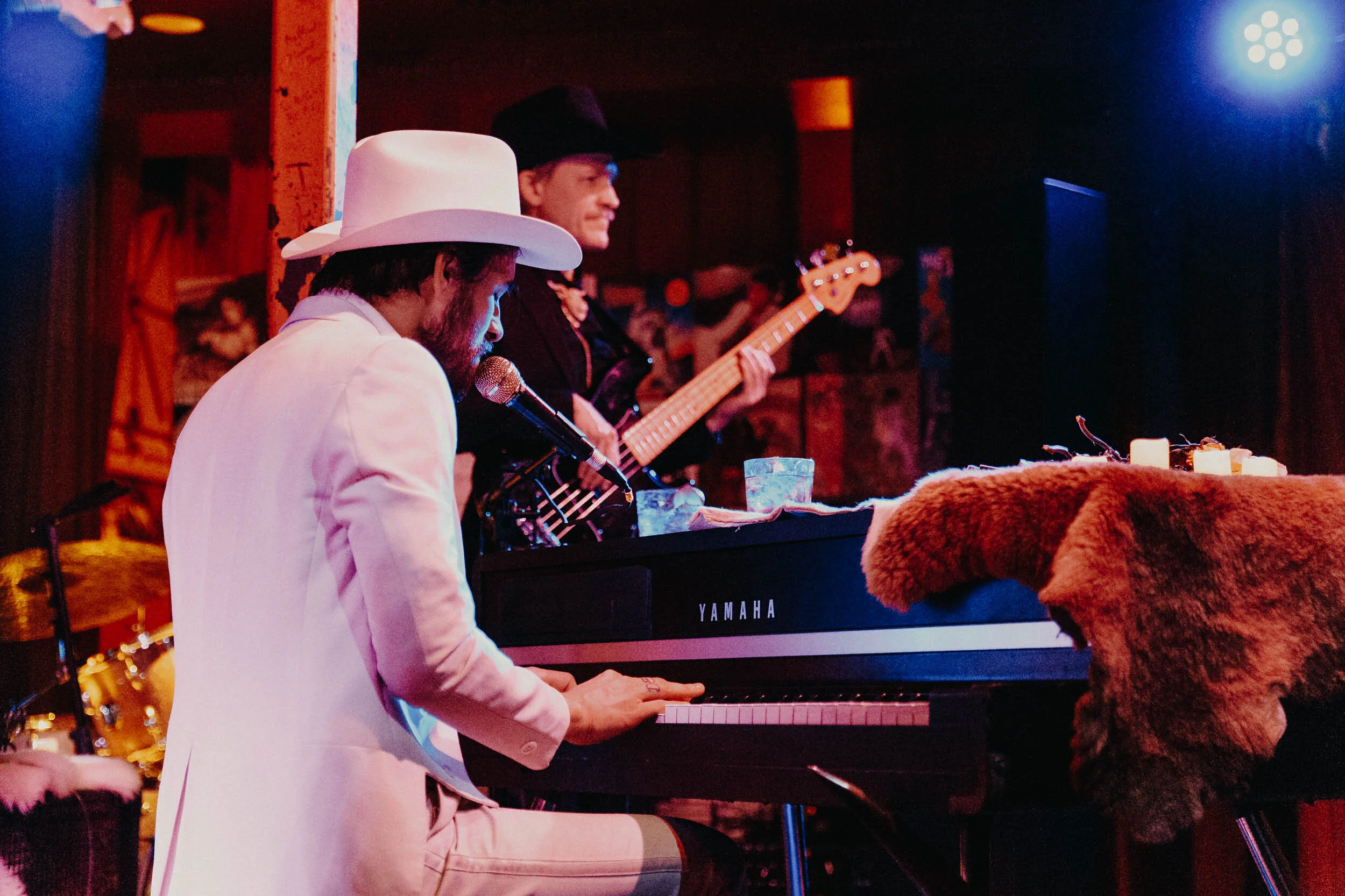 Robert Ellis, once regarded as a canny Texas troubadour in Country and winsome rock, has adopted a fully formed persona in his current record as the “Texas Piano Man,” resplendent in an all-white tuxedo tinkling the ivories. He and his four-piece band, dressed stoically in all black suits, took their Texas Piano Man tour to the packed basement of the Songbyrd Music House and Record Café.