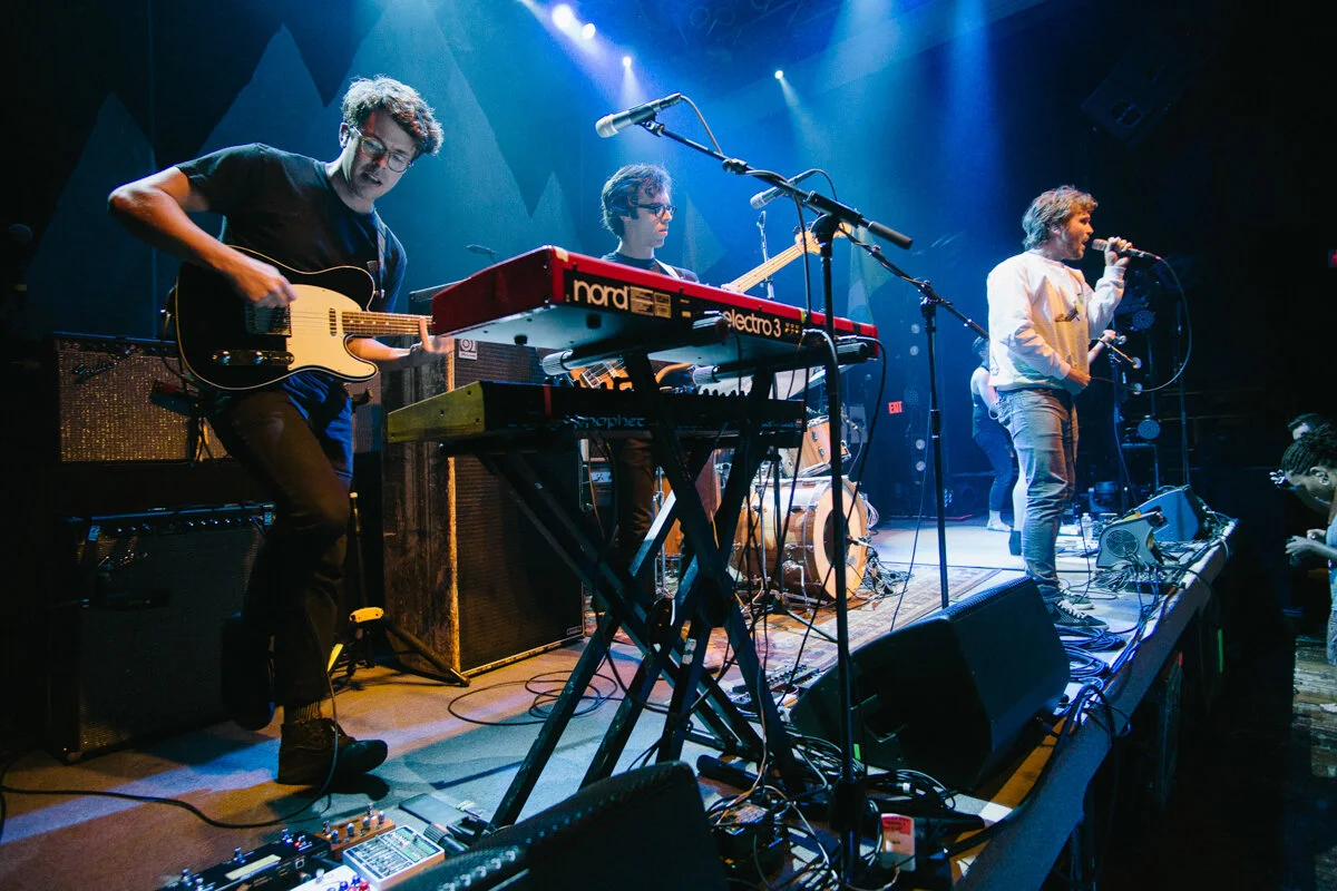 Appearing on the flag-adorned stage, Young the Giant used night 2 of their three-night 9:30 Club stay to play their latest album, Home of the Strange, in its entirety, saving older songs for the encore. They had the crowd’s attention from the start thanks to singer Sameer Gadhia’s fervent moves on stage and guitarist Eric Cannata’s equally-energetic strumming. “Titus Was Born” allowed Cannata to provide some deeper vocals that nicely contrasted with Gadhia’s as the backdrop’s stars twinkled brightly and the flags at the edges of the stage blew in the (fan-provided) wind. The conga-inspired beat behind “Nothing’s Over” provided another fun moment as Gadhia did his best Running Man and played his cowbell while the whole band did synchronized stage dancing on the beat.